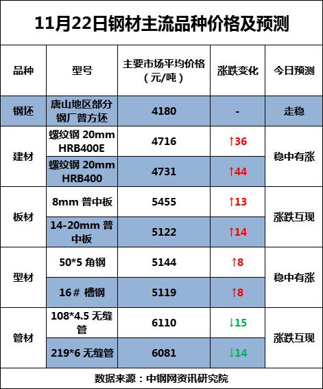 22日,期钢普遍上涨,期螺涨96,期卷涨39。现货市场,唐山地区普方坯走稳,报4250元/吨,含税出厂,各主流品种钢价上涨为主。四季度以来,国家继续对中小微企业提供贷款绿色通道,加速制造业发展。随着企业资金问题得到解决,生产和扩产得以保障,进而促进和原材料的采购,也拉动了钢材需求,利好中长期钢价。国际方面,供应链断裂的问题仍然存在,由于圣诞节临近,不少商家开始让货物“打飞的”,货运成本螺旋上升。综合来看,预计今日钢价仍然试探性上涨为主。