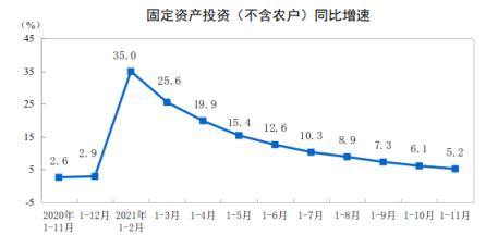 统计局:中国1-11月固定资产投资同比增长5.2%