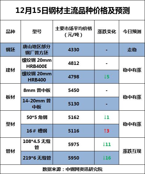 15日,期钢小幅上涨,期螺主力涨47,热卷主力涨69。现货市场,唐山地区普方走稳,报4330元/吨,含税出厂,各主流品种钢价上涨为主。由于上半年粗钢产量较大,为保障粗钢年产量不超标,下半年粗钢产量有所缩减。临近年关,粗钢产量基本维持可控范围,11月粗钢产量止跌小幅上涨,预计12月粗钢产量将会继续小幅上涨。此外,为保障市场资金流动性,此次降准将会在短期之内提振需求,利好经济。预计今日钢价仍然维持试探性上涨为主。