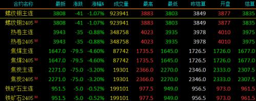19日黑色系螺纹钢主力跌41,收报3808,跌幅1.07%;热卷主力跌35,收报3943,跌幅0.88%;焦煤主力跌79.5,收报1647,跌幅4.6%;焦炭主力跌75,收报2271,跌幅3.2%;铁矿石跌5,收报951.5,跌幅0.52%。