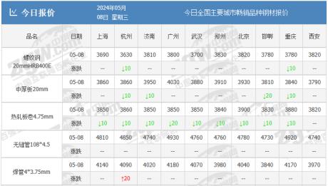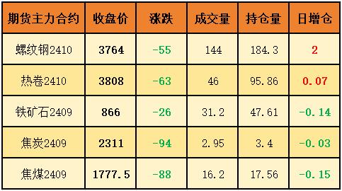 5月8日,期货方面,今日黑色系大幅下跌,螺纹收3674元跌55,热卷收3808元跌63,铁矿收866元跌26,焦炭收2311元跌94,焦煤收1777.5元跌88。