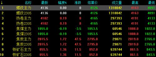12日螺纹钢主力稳,收报4136;热卷主力涨8,收报4182,涨幅0.19%;焦煤主力跌3.5,收报1855,跌幅0.19%;焦炭主力涨47.5,收报2815.5,涨幅1.72%;铁矿石涨11.5,收报855.5,涨幅1.36%。