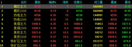 17日夜盘螺纹钢主力涨8,收报4170,涨幅0.19%,环比上周五夜盘涨107;热卷主力涨15,收报4258,涨幅0.35%;焦煤主力涨6.5,收报1890.5,涨幅0.35%;焦炭主力涨10.5,收报2822,涨幅0.37%;铁矿石涨0.5,收报885.5,涨幅0.06%。