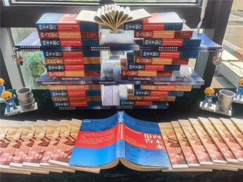 图为文学爱好者、南钢党委副书记王芳(右三)与《报告》三部曲被采写单位代表接受赠书。