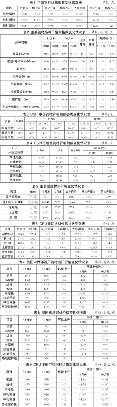 11月份,CSPI综合指数总体呈窄幅波动走势。其中第一周下降,第二周、第三周小幅上行,第四周小幅下降;进入12月份以来,钢材价格连续3周回升。