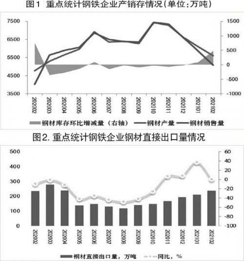 上述统计数据表明:重点统计钢铁企业2月份钢材生产、销售同比大幅增长,说明钢材市场明显好于去年疫情期间水平。2月份日产环比上升、日销环比下降,钢材产销率环比下降,受春节假期的影响,钢材国内市场需求下降,增产的钢材一部分转化为了库存。重点统计钢铁企业2月份钢材直接出口量同比增幅回落。
