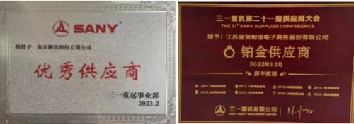 峰会期间,三一集团介绍了企业发展历程、经营业绩和未来发展规划,对各供应商伙伴的支持表示衷心感谢。三一集团对南钢在技术创新、品种开发、产品保供、质量提升、数智赋能等方面给予企业全方位的支持表示感谢,并为南钢颁发了“最佳服务奖”“优秀供应商奖”,为南钢旗下的江苏金贸钢宝电子商务股份有限公司颁发了“铂金供应商奖”,感谢南钢为三一集团发展所做出的卓越贡献,并希望与南钢在2023年砥砺同行、聚势共赢。