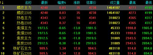 7日在黑色系铁矿石主力带动下,螺纹触及4300高点压力位,午后受整个大盘拖累,螺纹钢主力涨35,收报4248,涨幅0.83%;热卷主力涨16,收报4343,涨幅0.37%;焦煤主力跌13,收报1973.5,跌幅0.65%;焦炭主力跌11,收报2912.5,跌幅0.38%;铁矿石涨12,收报909.5,涨幅1.34%。