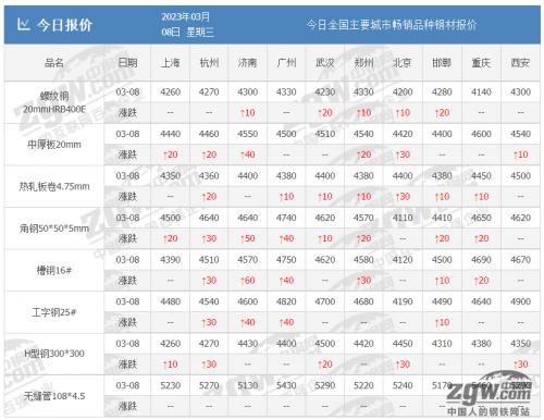 一、钢市影响因素 1、鲍威尔释放鹰派言论 美联储主席鲍威尔发表国会证词表示,将进一步加息以实现2%通胀目标,最终利率水平可能高于先前预期,如果有必要将加快加息步伐。鲍威尔指出,尽管近几个月来通胀有所缓和,但通胀压力高于上次会议时的预期。 分析师观点:目前国际经济形势依然紧张,通胀率仍然高于联储的长期目标2%,除了核心指标下降外,其他领域几乎没有出现通胀降低的迹象,美联储3月份加息50个基点的可能性大于加25个基点,释放鹰派言论,股指及期货市场下跌,带动市场恐慌情绪攀升,利空钢价走势。 2、2023全国两会中的房地产“声音” 要继续巩固房地产市场出现的好势头。要继续实施中央已经出台的稳房地产市场的举措,多种方式缓解房地产开发企业的流动资金困难,鼓励刚性和改善性住房消费需求,要把房地产市场稳住。 分析师观点:在二十大精神指导下,新一届领导人重点恢复经济建设,房地产作为重要的经济组成部分,多项扶持完善房地产行业发展政策出台,有效降低年轻群体的购房负担,同时多地市政府积极扩大内需,提振市场投资预期,增加钢材需求量,利好钢价走势。 3、3月12座高炉计划复产 政府投资和政策激励要有效带动全社会投资,今年拟安排地方政府专项债券3.8万亿元,加快实施“十四五”重大工程;完善现代物流体系,大力发展数字经济;加强城乡环境基础设施建设,持续实施重要生态系统保护和修复重大工程。 分析师观点:随着两会召开,更多利好消息释放,政策持续发力,多地市政府投资和政策激励带动全社会投资,促进经济活力,同时国家重点提出稳就业,让消费加速恢复,成为推动钢铁行业发展的关键,更多用钢需求量逐步启动,利好钢价走势。 二、价格方面 1、现货市场稳中偏强 据中钢网资讯研究院统计数据显示,今日钢材现货价格稳中偏强。 建材24个市场中,11个市场涨10-30元/吨,螺纹钢20mmHRB400E平均价格4316元/吨,较上个交易日均价涨13元/吨; 热卷24个市场中,16个市场涨10-30元/吨,4.75热轧板卷平均价格4401元/吨,较上个交易日均价涨14元/吨; 中厚板20个市场中,12个市场涨10-40元/吨,普中板Q235B平均价格4543元/吨,较上个交易日均价涨17元/吨。 来源:中钢网资讯研究院 2、钢厂稳中个涨 据中钢网资讯研究院数据显示,今日共21家钢厂调价,其中: 上调9家,占比42.9%,调价幅度10-30元/吨; 持平12家,占比57.1%。 3、期货触底反弹 8日螺纹钢主力涨11,收报4249,涨幅0.26%;热卷主力稳,收报4341;焦煤主力涨2.5,收报1984,涨幅0.13%;焦炭主力跌25.5,收报2894,跌幅0.87%;铁矿石涨7.5,收报912,涨幅0.83%。 钢价预测 目前国家重点恢复经济发展,政府债券及财政政策持续向好,央行资金扶持力度加大,基建、房地产、制造业等数据超预期,居民消费逐步恢复,市场投资预期上升,扩大用钢需求量,加上截止3月7日中国45港进口铁矿石库存总量13927.86万吨,环比上周一减少147万吨,铁矿石及焦炭成本支撑强劲,钢企出厂价格维持高位,商家补库谨慎,预计明日钢材价格或将稳中个涨运行。