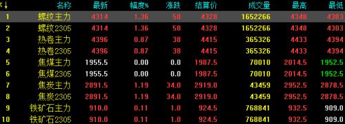 10日螺纹主力合约最高4348元/吨,日内涨逾1%。螺纹钢主力涨58,收报4314,涨幅1.36%;热卷主力涨38,收报4396,涨幅0.87%;焦煤主力稳,收报1955.5;焦炭主力涨34,收报2891.5,涨幅1.19%;铁矿石涨1,收报910,涨幅0.11%。