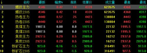 10日夜盘螺纹钢主力涨18,收报4346,涨幅0.42%;热卷主力涨25,收报4440,涨幅0.57%;焦煤主力稳,收报1987.5;焦炭主力涨8.5,收报2927.5,涨幅0.29%;铁矿石跌1.5,收报923,跌幅0.16%。
