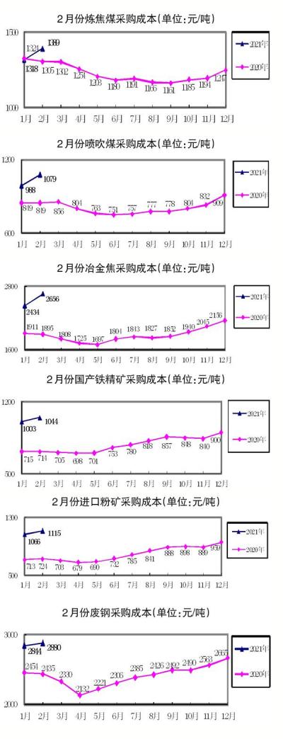 2月份,主要原燃料采购成本全面上升,煤焦产品采购成本升幅均在5%以上。