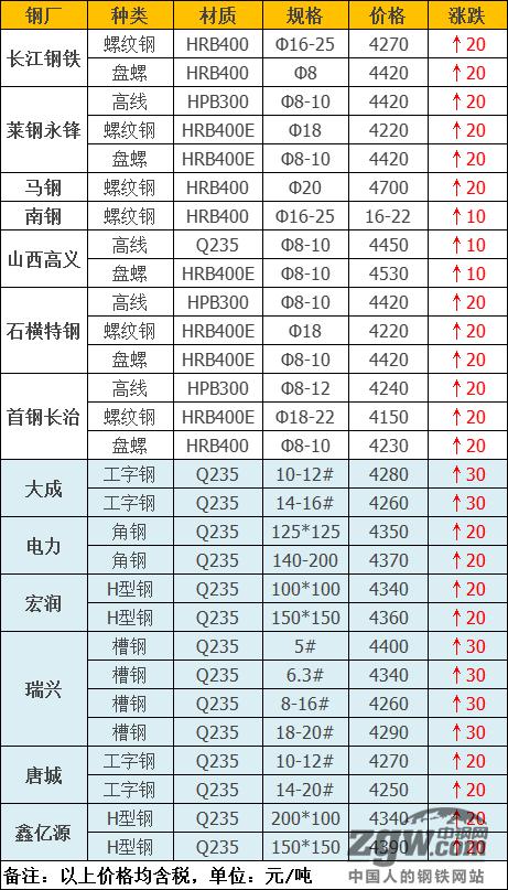 华北地区调价 山西晋南建材价格平稳 山西美锦建材价格平稳 山西高义建材价格上调10元/吨 首钢长治建材价格上调20元/吨 正丰角钢价格平稳 欧联槽钢价格平稳 电力角钢上调20元/吨 宏润H型钢上调20元/吨 大成工字钢上调30元/吨 唐城工字钢上调20元/吨 鑫亿源H型钢上调20元/吨 瑞兴/瑞隆槽钢上调30元/吨 瑞丰带钢价格平稳 敬业中厚板价格平稳 普阳中厚板价格平稳 其他地区调价 马钢建材上调20元/吨 南钢螺纹钢上调10元/吨 长江钢铁建材上调20元/吨 石横特钢建材价格上调20元/吨 莱钢永锋建材价格上调20元/吨 钢厂调价占比 据中钢网资讯研究院数据显示,今日共20家钢厂调价,其中: 上调13家,占比65%,调价幅度10-30元/吨; 持平7家,占比35%。 废钢调价信息 3月29日潍坊特钢钢厂废钢采购价格上调30元,增值税普通发票:重废3111,特级废钢3060;含3%增值税专用发票:重废3203,特级废钢3151。单位:元/吨。 3月29日徐州中环(中新钢铁)废钢价格上调30元,调后:优质钢板料3030,钢板料、模具钢、钢筋切粒、冲子2980,优重2950,留槽、钢筋头、锻打、工厂废料2920,统料、汽车拆件、模板2780,矽钢片、2厚以上锻打、弹簧板2900,钢圈2860,工角槽2880,不含税,单位:元/吨。 3月29日起河南舞钢废钢采购价格上调30元,执行价:重型废钢3360,中型废钢3270,小型废钢3110,轻薄料1790,钢筋切粒3340,以上价格为含税承兑价,其他政策不变。 3月29日江阴西城废钢价格上调30元,调后执行价:新钢板料、钢筋切头(12mm以上)3080,重废(大中型钢,工业拆废类,50mm以内,马蹄铁)2980,中废(混装料,6mm以上)2950,剪料(管子,角铁,大C型钢,4mm以上)2900,不含税 3月29日起重庆钢铁废钢挂牌价上调20-30元:重废一号2930,重废三号2890,中废2850,边一2930,边二2900,钢筋切头3050,工业薄料压块2850,钢筋压块2880,破碎废钢2870,,统废2550,工业薄料(二系列用)2860,铁屑压饼2560,统料压块2620,二级破碎废钢2820。不含税。 3月29日浙江誉鑫废钢价格上调30元,调后执行价:钢筋切粒3010,新钢板2900,优重2870,重废2850,中废2780-2800,中剪2730-2750,小剪2660-2680,小废2600-2620,普通刨花2460-2480,数控刨花2560-2580,冷热轧冲子2820,镀锌冲子2800,不含税。 3月29日镇江鸿泰废钢价格上调30元,调后执行价:新钢板料2960,优重、钢筋头2930,马蹄铁2920,钢筋压块2870,冷轧、热轧、冲子2910,矽钢片2930,重废2880,破碎料2590-2880,剪切料2740-2770,钢刨花2680-2730,不含税。 3月29日扬州秦邮废钢价格上调30元,调后:钢筋切粒3020,钢板料、模具钢3020,重废一2990,重废二2960,机械生铁2920,冲子2970,中废2820,剪料2620,矽钢片2970,锻打料、马蹄铁2940,钢筋压块一2970,钢筋头2970,不含税,单位:元/吨。 3月29日福建亿鑫废钢价格上调30元/吨,既炉料含税价3210元/吨、精料含税价3330元/吨、冲子料含税价3310元/吨、钢筋压块含税价3190元/吨、锻打料含税价3230元/吨。 3月29日广东揭阳国鑫废钢收购价上调30元:7公分钢筋切粒3090元/吨(10厘以上),模具3110元/吨(80公分内),注塑机厚拖板料3090元/吨(80公分内),生铁3080元/吨,纯钢筋包3030元/吨,6厘厚以上割料剪料3050(50公分内),3厘厚以上剪料2930(50公分内),不含税。 3月29日内蒙古大安废钢价格上调50元后现执行:钢筋豆:2880元/吨;小型一:2930元/吨;小型二:2880元/吨;小型三:2850元/吨;入炉一:2850元/吨;入炉二:2800元/吨;入炉三:2750元/吨;大料一:2730元/吨;大料二:2700元/吨;大料三:2600元/吨。 3月29日扬州恒润海洋重工废钢价格上调50元,最新执行价:边角料一3265,边角料二3222,边角料三3179,优重3233,重废一3190,重废二3147,重废三3093,含税。