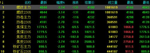 3日螺纹钢主力跌131,收报4044,跌幅3.14%;热卷主力跌116,收报4181,跌幅2.7%;焦煤主力跌69.5,收报1779.5,跌幅3.76%;焦炭主力跌102,收报2622.5,跌幅3.74%;铁矿石跌18.5,收报890.5,跌幅2.04%。