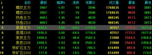 10日螺纹钢主力跌76,收报3907,跌幅1.91%;热卷主力跌59,收报4003;焦煤主力跌64.5,收报1696.5,跌幅3.66%;焦炭主力跌49,收报2490.5,跌幅1.93%;铁矿石跌14.5,收报777,跌幅1.83%。