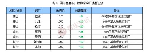 二、钢厂及大矿动态1.国内主导钢厂动态本周多地钢企下调采购价格,压价态度明显,库存维持低位运行。唐山钢企本周采购价格下调5-20元。山东钢企采购价格下调34元。辽宁本钢、新抚钢下调12元。内蒙中唐特钢本周采购价格大幅下调95元至1010元。湖北钢厂小幅下调10元。综合看,钢厂高炉开工率和铁水产量虽然较高,但盈利率连续下降,成材需求差,短期内钢厂补库仍会以刚需为主。