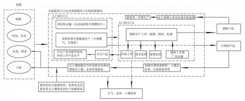 1.边界系统扩展:将生物质热解气化-生物炭生产纳入系统边界内,全废钢绿电钢工艺系统边界由“从大门到大门,包括废钢循环”扩展到“从摇篮到大门,包含废钢循环与生物质燃气生物炭(还田还林)碳循环”系统边界,钢铁工业与农林业生态产业实现一体化。