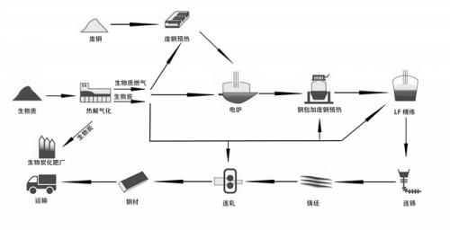(2)以步骤(1)得到的生物质燃气完全替代短流程钢生产中的化石能源,以步骤(1)得到的部分生物炭替代短流程钢生产中的全部或部分化石辅助材料。