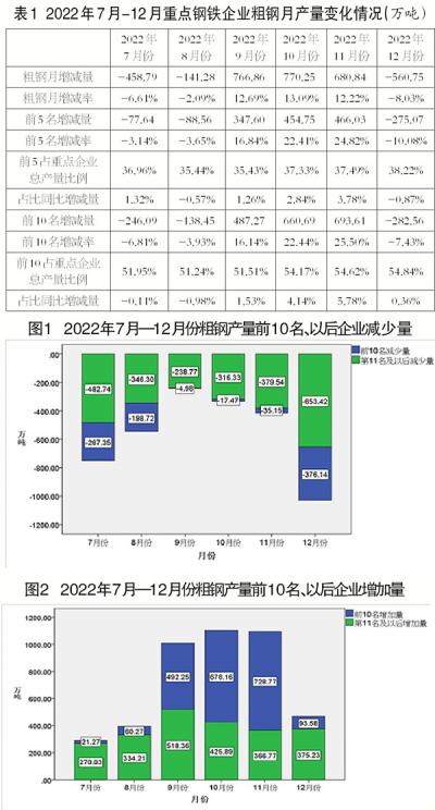 对于粗钢月产量前10名及以后企业分别考察其减量、增量数据,可见2022年下半年的减少量多数在第11名及以后企业,2022年下半年除10月份、11月份外各月产量的增加量也集中在第11名及以后的企业。