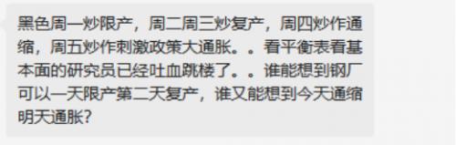 这一周钢材先是限产,后是复产,有通胀又有通缩,行情大涨大跌,现货紧跟期货,甚至有些贸易商现货操作的频率超过期货开平仓的速度,看到盘面有小反弹立马追补现货,在价格下行趋势中,这种操作方式是有很大风险的,“抢跑”的现货商又要难熬了。