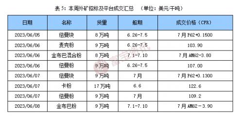 2.国内外矿钢动态加拿大本次火灾对铁矿石供应几乎没有影响据悉,本周二加拿大魁北克省和拉不拉多省之间的铁路发生大火,对运输产生短暂影响,虽然加拿大铁矿石公司的铁矿位于加拿大拉布拉多地槽的南部,但是本次火灾对铁矿石供应几乎没有影响,原因如下:1、近三年加拿大铁矿石出口仅占全球铁矿石出口的0.8%;2022财年IOC产量为1756万吨,即单周发运量约在33万吨左右。2、近三年加拿大铁矿石出口到中国的比例仅约28.9%;3、目前加拿大正处于传统的火灾季,往年6-8月份期间发运量均环比略有走弱,并不属于突发事件。因此综合而言,我们认为本次火灾对铁矿石供应几乎没有影响。海关总署:中国5月铁矿砂及其精矿进口9617.5万吨海关总署:中国5月铁矿砂及其精矿进口9617.5万吨,较上月增加573.3万吨,环比增长6.3%;4月为9044.2万吨。1-5月累计进口铁矿砂及其精矿48074.8万吨,同比增长7.7%。
