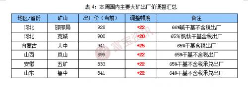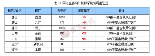 二、钢厂及大矿动态1.国内主导钢厂动态本周多地钢企采购价格以涨为主,保持低库存谨慎询货操作。唐山钢企本周采购价格小幅上调5元,受限产影响铁水产量有所下降。山东钢企本周上调25元。吉林钢企上调40元。山西钢企价格上调22元,因钢材去库情况较好,钢企复产积极性提升。综合看,钢厂目前处于微利润和良好的钢材去库状态,铁水高位,减产压力降低,后续需关注钢厂利润及成材表需向好的持续性。