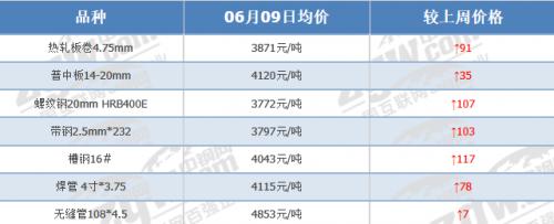 6月5日-6月9日,螺纹钢涨115元收3711,热卷涨101元收3823,焦炭涨85元收2076.5,铁矿石涨66.5元收812。