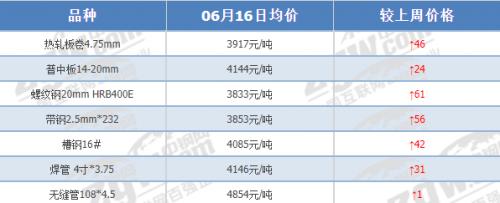 6月12日-6月16日,主力合约:螺纹钢涨88元收3799,热卷涨76元收3899,焦炭涨38.5元收2180,铁矿石涨3元收815。