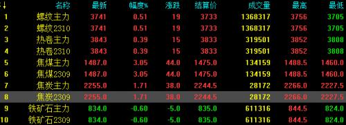 19日螺纹钢主力涨19,收报3741,涨幅0.51%;热卷主力涨15,收报3843,涨0.39%;焦煤主力涨44,收报1487,涨幅3.05%;焦炭主力涨38,收报2255,涨幅1.71%;铁矿石跌5,收报834,跌幅0.6%。