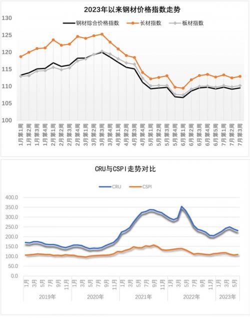 7月21日,中国钢材价格指数(CSPI)为109.49点,周环比上涨0.38点,涨幅为0.35%;比上月末上涨0.30点,涨幅为0.27%;比去年底下降3.76点,降幅为3.32%;同比下降1.18点,降幅为1.07%。其中,长材价格指数为112.88点,周环比上涨0.44点,涨幅为0.39%;比上月末上涨0.19点,涨幅为0.17%;同比下降3.46点,降幅为2.97%。板材价格指数为110.18点,周环比上涨0.39点,涨幅为0.35%;比上月末上涨0.48点,涨幅为0.44%;同比上涨0.37点,涨幅为0.34%。