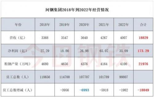 8月2日,2023年《财富》世界500强排行榜发布。河钢集团以595.63亿美元的营业收入名列第229位,连续15年上榜世界500强榜单。根据此情况,笔者对于河钢集团2018年到2022年5年的经营情况进行了整理,发现存在以下特点: 从3000亿到4000亿的跨越 根据表格显示,河钢集团从2018年的3368亿开始,2019年到2021年实现营收三连升,首次突破4000亿关口。2022年营收虽然相比2021年下降260亿,但依然维持在4000亿以上的水平。 净利润均超过18亿 纵观2018年到2022年,河钢集团的净利润基本维持在18亿以上的量级。2021年达到高峰,超过65亿,2022年又降至35.09亿,下降幅度近30亿。 从以上营收和净利润双下降的指标来看,2022年钢铁行业面临着严峻的市场形势挑战。 粗钢产量在4000万吨以上 2018年到2022年,河钢集团的粗钢产量一直呈现下降态势,累计下降幅度达580万吨。从冲破4600万吨,直指5000万吨的大关,到回落到4100万吨的4000万吨级别。总体来看,河钢集团的粗钢产量呈现弱势。一方面表明粗钢产量有进行持续压减的可能。另外一方面从营收和利润总体提升的角度,也表明其或正在加速推进转型升级,推动产品价值提升。 员工减少1.88万 从11.86万人,到9.98万人,河钢集团2018年到2022年经历了员工总数的大幅减少。尤其是在2020年,河钢集团员工人数减少近7000人,总体5年间下降近1.9万人。 综合以上,五年的时间,河钢集团虽然经历了员工减少、粗钢产量下降的情况,但是营收仍处于4000亿级别,净利润也是处于相对较高的水平。在钢铁行业市场严峻形势的挑战中,河钢集团穿行而来,这也充分证明了河钢集团强大的发展实力。展望未来五年,河钢集团也树立了超过6000亿级的新目标! 2023年5月24日—25日,中国共产党河钢集团有限公司第二次代表大会在河北石家庄举行。于勇代表中国共产党河钢集团有限公司第一届委员会向大会做主题报告,提出了河钢未来5年发展蓝图,即“到2027年,区位调整后优势充分发挥,资产效能充分释放,产业结构更加优化,产学研深度融合,科技创新实力大幅增强,营业收入超过6000亿元,世界500强位次进一步提升,产品市场优势和企业综合竞争力行业领先,成为具有世界品牌影响力,钢铁材料、新兴产业、海外事业与金融服务协同发展的跨国工业集团”。 来源:今日钢铁,版权归原作者所有,如有侵权,请联系删除