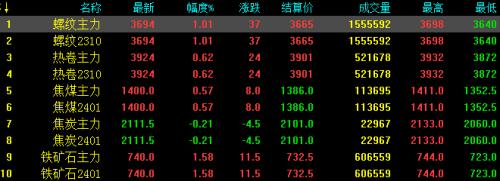 15日螺纹钢主力涨37,收报3694,涨幅1.01%;热卷主力涨24,收报3924,涨0.62%;焦煤主力涨8,收报1400,涨幅0.57%;焦炭主力跌4.5,收报2111.5,跌幅0.21%;铁矿石涨11.5,收报740,涨幅1.58%。