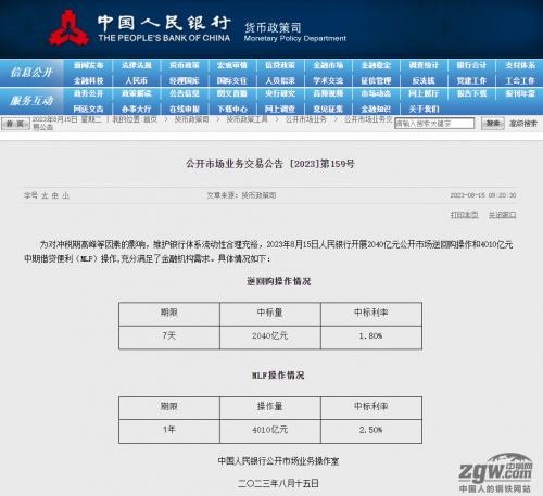 8月15日,人民银行发布消息称,为对冲税期高峰等因素的影响,维护银行体系流动性合理充裕,人民银行开展2040亿元公开市场逆回购操作和4010亿元中期借贷便利(MLF)操作,充分满足了金融机构需求。其中,MLF利率下调15个基点至2.5%;7天期逆回购利率下调10个基点至1.80%。