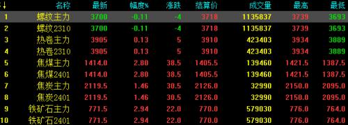 18日螺纹钢主力跌4,收报3700,跌幅0.11%;热卷主力涨5,收报3905,涨0.13%;焦煤主力涨38.5,收报1414,涨幅2.8%;焦炭主力涨30.5,收报2119.5,涨幅1.46%;铁矿石涨22,收报771.5,涨幅2.94%。