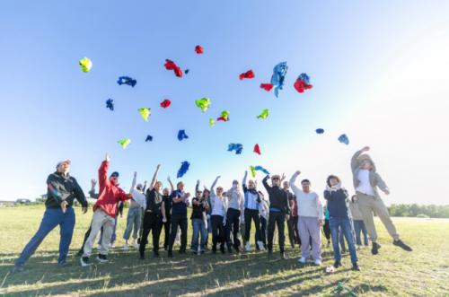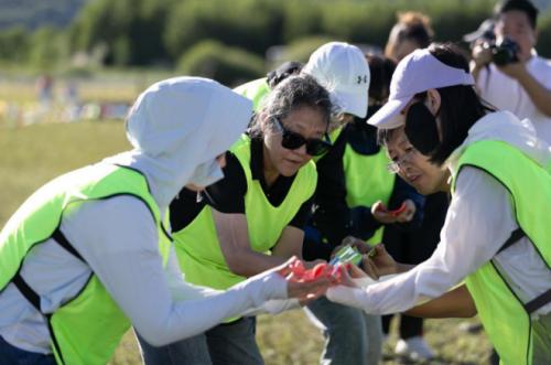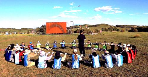 在拓展活动的最后,大家围坐在草坪上,手中握着同一条绳索,每个人尽全力才能拉成一个标准的圆。大家拉紧绳索,挥舞双臂上—左—下—右旋转,感受彼此支撑的团结力量。正如一代又一代护林人所传达的塞罕坝精神,只有艰苦奋斗、甘于奉献、团结一致,才能让黄沙遮天的茫茫荒原变为如今林的海洋。
