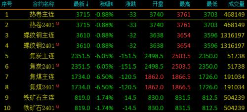 10日螺纹钢主力跌32,收报3610,跌幅0.88%,最低3596创近五个月新低;热卷主力跌33,收报3715,跌幅0.88%;焦煤主力跌120.5,收报1734,跌幅6.5%;焦炭主力跌151.5,收报2351.5,跌幅6.05%;铁矿石跌14.5,收报819,跌幅1.74%。