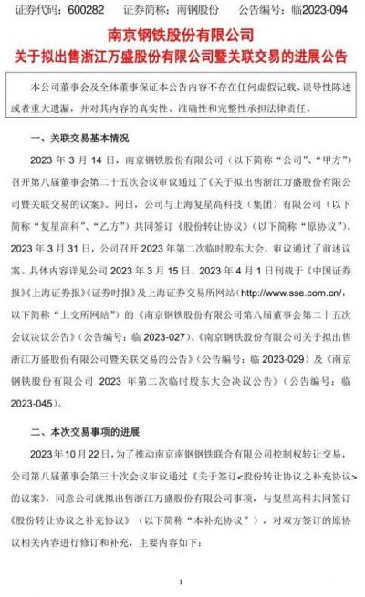 南京钢铁股份有限公司发布关于拟出售浙江万盛股份有限公司暨关联交易的进展公告,根据公告内容显示,同意公司就拟出售浙江万盛股份有限公司事项,与复星高科共同签订《股份转让协议之补充协议》,具体内容如下: 南钢股份是全球最大的单体中厚板生产基地之一及国内具有竞争力的特钢长材生产基地,以专用板材、特钢长材为主导产品,具备年产900万吨生铁、1000万吨粗钢和940万吨钢材的综合生产能力。 来源:今日钢铁