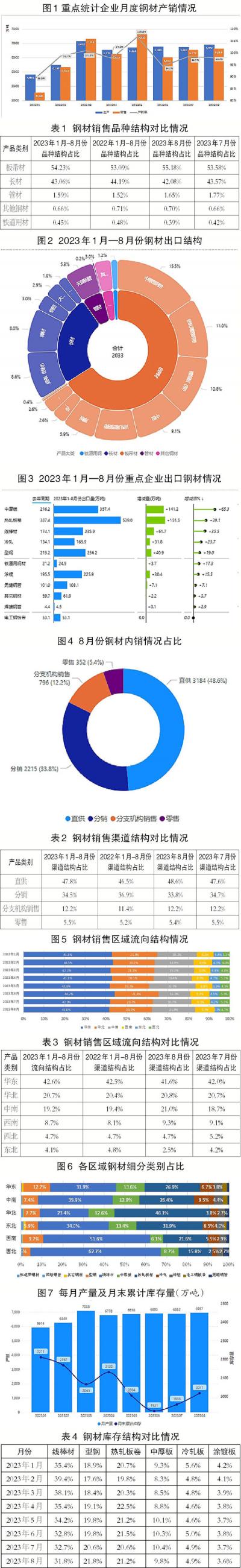 8月份,重点企业内销钢材量为6547万吨,内销占比为96%。其中,通过直供渠道销售钢材量、通过分销渠道销售钢材量、通过分支机构销售钢材量、零售销售钢材量占比分别为48.6%、33.8%、12.2%、5.4%。