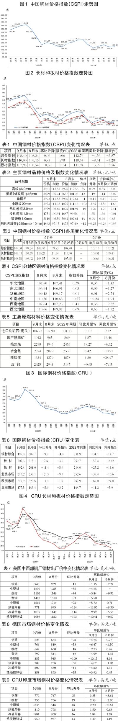9月份,CRU国际钢材价格指数为197.8点,环比下降9.9点,降幅为4.8%;同比下降34.1点,同比降幅为14.7%。