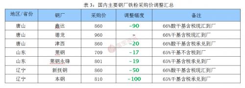 本周国内主导钢厂低库存运行为主。钢企限产已成常态,对内粉需求不高,压价态度坚决,而矿选无低价售库意愿,供需双方僵持。唐山地区环保预警持续中,钢企限产再收紧,采购计划暂无,现鑫达66%干基含税到厂价860降90,津西在860。河北地区,武安钢企受限产影响,按需采购为主,虽本地大矿价格高要,但市场接受度较低,无成交。东北地区钢企对后市仍不看好,且因限产原因库存较低,采购节奏放缓,仍有压价意愿,现凌钢66%干基含税采购价860,本钢65%干基含税到厂价810,新抚钢860,市场多关注本钢、新抚钢下旬定价。山东地区部分钢企有复产计划,需求将有所好转。预计短期内钢企将维持低库存运行。