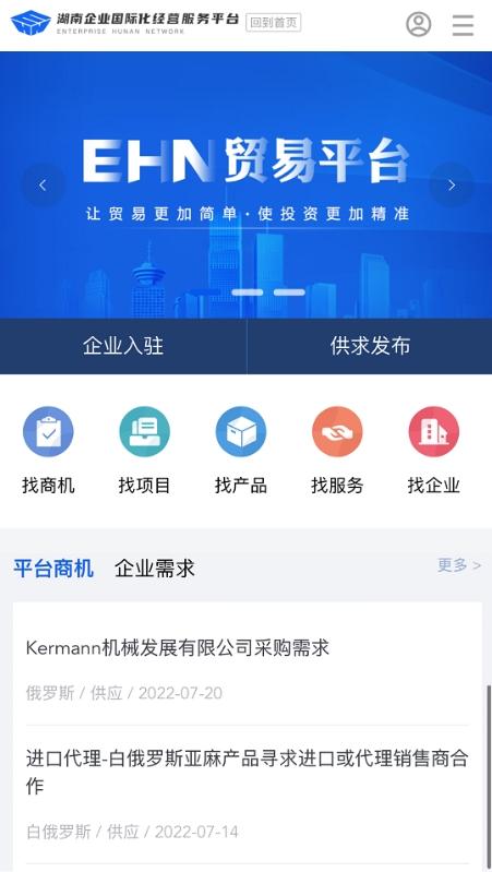 湖南企业国际化经营服务平台(Enterprise Hunan Network,简称EHN),是湖南省人民政府建设开发的公益性经贸信息平台。主要围绕“国际投资”“国际贸易”两大核心业务,联通政企、融通内外、畅通供需,为中小企业提供在线国际商务咨询、供需配对、商事法律、投融资与担保、数字会展、经贸情报分析等服务,解决中小企业商机信息获取难、贸易投资开展难、出海风险应对难等痛点难点,打造内陆地区的“网上丝路”。