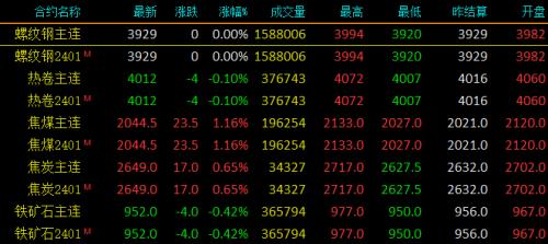 17日黑色系螺纹钢主力稳,收报3929;热卷主力跌4,收报4012,跌幅0.1%;焦煤主力涨23.5,收报2044.5,涨幅1.16%;焦炭主力涨17,收报2649,涨幅0.65%;铁矿石跌4,收报952,跌幅0.42%。