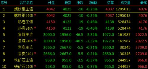 11日螺纹钢主力跌10,收报4025,跌幅0.25%;热卷主力跌19,收报4122,跌幅0.46%;焦煤主力跌46.5,收报1956,跌幅2.32%;焦炭主力跌5.5,收报2667,跌幅0.21%;铁矿石跌3.5,收报955,跌幅0.37%。
