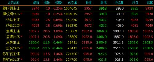 20日黑色系螺纹钢主力涨10,收报3940,涨幅0.25%;热卷主力涨28,收报4058,涨幅0.69%;焦煤主力涨20.5,收报1907.5,涨幅1.09%;焦炭主力跌11.5,收报2500,跌幅0.46%;铁矿石涨13.5,收报939,涨幅1.46%。