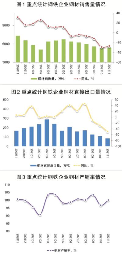 据营销月报统计(剔除了因营销统计企业数量增减对合计钢材销量增减的影响),2021年11月份,重点统计钢铁企业销售钢材5383.37万吨,同比下降26.69%;钢材日销水平为179.45万吨,日销环比上升5.06%。其中,国内销售钢材5297.89万吨,同比下降26.17%;直接出口钢材85.48万吨,同比下降49.0%。当月钢材产销率为100.18%,环比上升3.33个百分点,同比下降0.65个百分点。