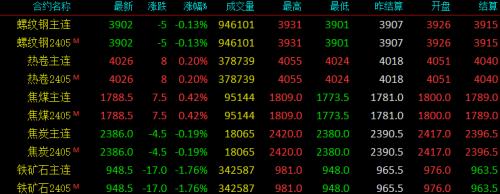 12日黑色系螺纹钢主力跌5,收报3902,跌幅0.13%;热卷主力涨8,收报4026,涨幅0.2%;焦煤主力涨7.5,收报1788.5,涨幅0.42%;焦炭主力跌4.5,收报2368,跌幅0.19%;铁矿石跌17,收报948.5,跌幅1.76%。
