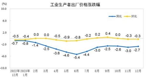 受寒潮天气及节前消费需求增加因素影响,12月CPI环比由降转涨,同比下降0.3%,环比上涨0.1%。受国际油价继续下行、部分工业品需求不足因素影响,12月全国PPI同比下降2.7%,环比下降0.3%。