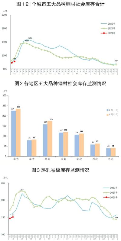 1月中旬,五大品种钢材社会库存环比均有所上升,其中螺纹钢为增量最大品种,线材为增幅最大品种。热轧卷板库存为151万吨,环比增加4万吨,上升2.7%,库存继续上升,升幅略有扩大;比今年初增加7万吨,上升4.9%;比去年同期减少35万吨,下降18.8%。冷轧卷板库存为110万吨,环比增加4万吨,上升3.8%,库存继续上升,升幅扩大;比今年初增加7万吨,上升6.8%;比去年同期减少16万吨,下降12.7%。中厚板库存为105万吨,环比增加4万吨,上升4.0%;比今年初增加7万吨,上升6.8%;比去年同期减少16万吨,下降12.7%。线材库存为99万吨,环比增加7万吨,上升7.6%,库存持续上升;比今年初增加11万吨,上升11.7%;比去年同期减少4万吨,下降3.7%。螺纹钢库存为358万吨,环比增加23万吨,上升6.9%,库存继续上升,升幅有所扩大;比今年初增加53万吨,上升17.4%;比去年同期减少36万吨,下降9.1%。