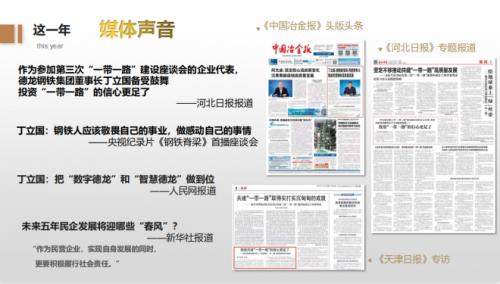 三是关注绿色低碳发展,关注企业社会责任。丁立国参加了大量的绿色环保和低碳活动,包括亚布力论坛。本身德龙是绿色发展的标杆、环保绩效A类企业,但是他对此不遗余力,即为了德龙、新天钢的永久性标杆,更为了向社会传播绿色钢铁的理念,树立绿色钢铁的行业形象。