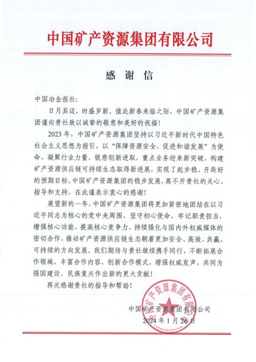 日月其迈,时盛岁新。值此新春来临之际,中国矿产资源集团向中国冶金报社发来感谢信。信中提到,中国矿产资源集团期待与中国冶金报社继续携手同行,不断拓展合作领域,丰富合作内容,创新合作模式,增强权威发声,共同为强国建设、民族复兴作出新的更大贡献!
